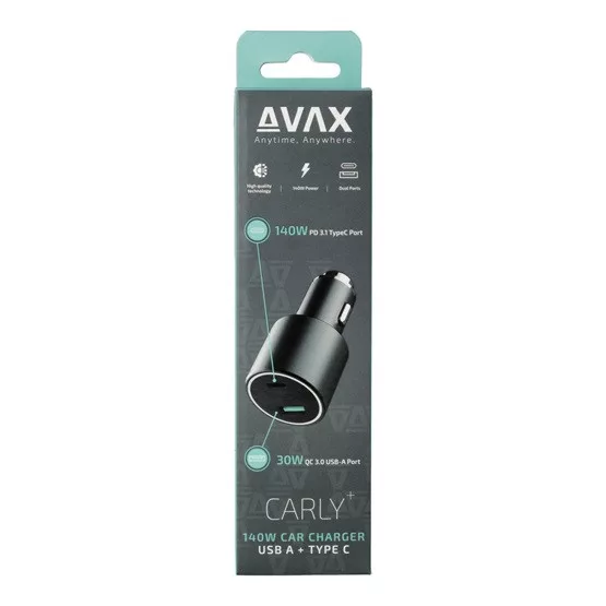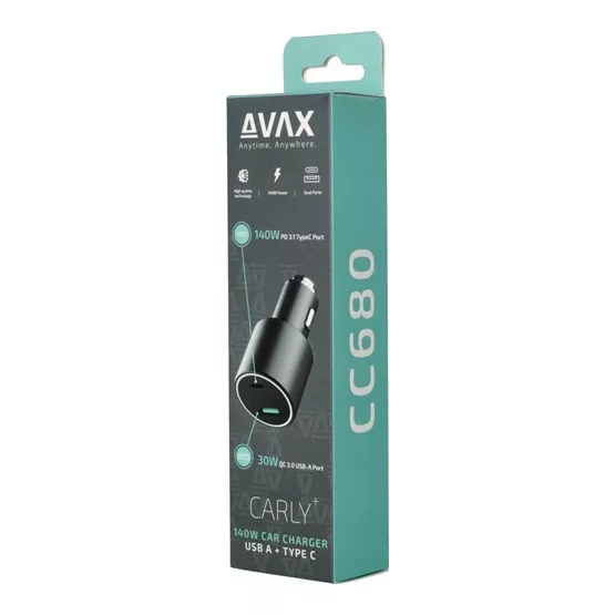 AVAX CC680B CARLY+ USB A + Type C 140W autós töltő, fekete