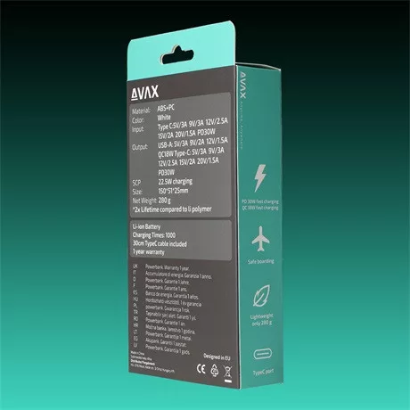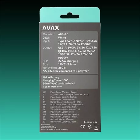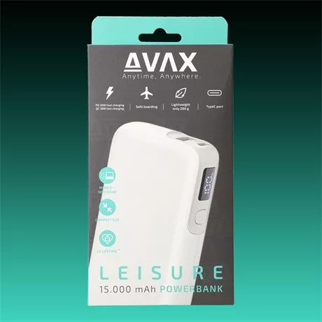 AVAX PB106W LEISURE PD/USB-C 30W+QC 18W 15.000mAh gyorstöltő powerbank, fehér