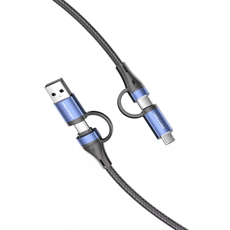 A Vention CTLLH egy USB kábel, amely 3 különböző csatlakozóval rendelkezik - 2 USB-C csatlakozó, egy USB-A és egy micro-USB. Mondjon búcsút a több kábel magával cipelésének vagy az adapterek elvesztésének! A CTLLH-val a legfontosabb csatlakozókat tarthatod kéznél. Az USB-A és a mikro-USB adapterek mindkét kábel csatlakozójához csatlakoznak, így soha nem fogod elveszíteni őket, és nem kell mindenhol keresgélned őket. A kábel részei korrózióálló alumíniumötvözetből készültek, és teljes hosszában pamutburkolat borítja, hogy megerősítse a szerkezetét. A kábelvégek burkolva vannak, hogy megakadályozzák a törést. Emellett támogatja a gyors töltést 100 W-ig.
