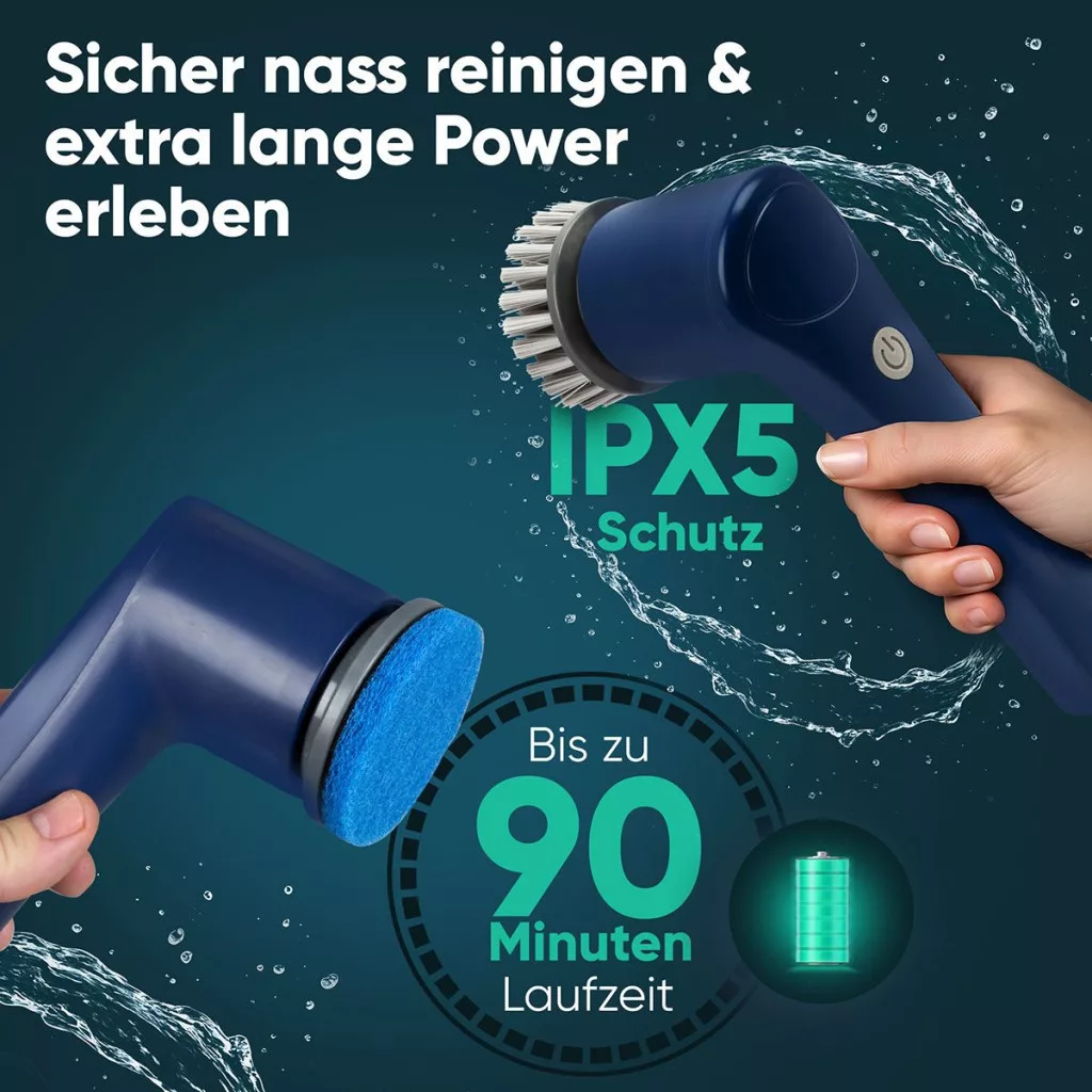 Erőteljes tisztítás – nagy teljesítményű motor 300 fordulat/perc fordulatszámmal és 8 stabil tartozékkal Mindennapi használatra alkalmas – extra hosszú, akár 90 perces üzemidő és IPX5 sugárálló ház Könnyű és praktikus a fáradtságmentes munkavégzéshez Az 1300 mAh-s akkumulátor kényelmesen tölthető a mellékelt USB-C töltőkábellel Ideális csempék, habarcsok, zuhanyzók, tornacipők, felnik, autók és grillrácsok tisztítására Erőteljes akkus tisztítókefe sokoldalú használathoz és makacs szennyeződések eltávolításához - ... Fürdőszoba csempe – ... Grill – ... Autó – ... Konyhai tűzhely – ... Edények – ... Cipő – ... Serpenyők – ... Ablak Kompakt kialakítás a nehezen elérhető helyekre Könnyű és praktikus a fáradtságmentes munkavégzéshez Nagy nyomatékú motor 300 fordulat / perc fordulatszámmal. Extra hosszú, akár 90 perces üzemidő. Vezeték nélküli egykezes működtetés (soft touch kapcsoló) Vízálló ház (IPX5) Tartozékok: USB-C töltőkábel, 8 tartozék Lítium-ion akkumulátor; 3,7 V; 1300 mAh; 38,55 g