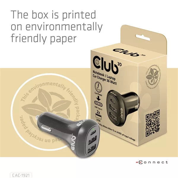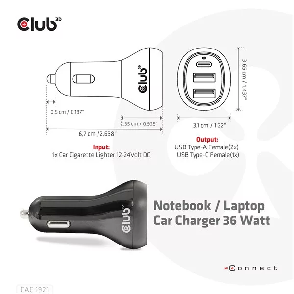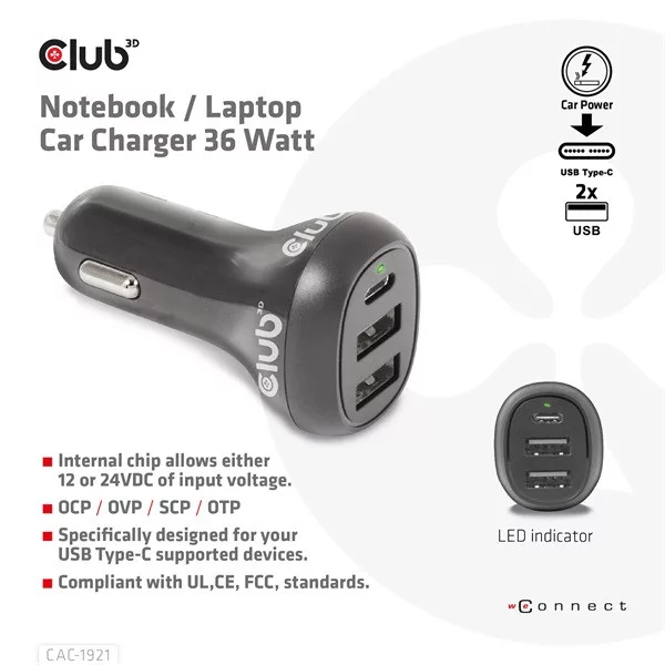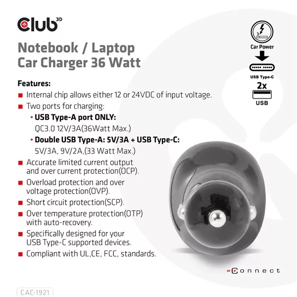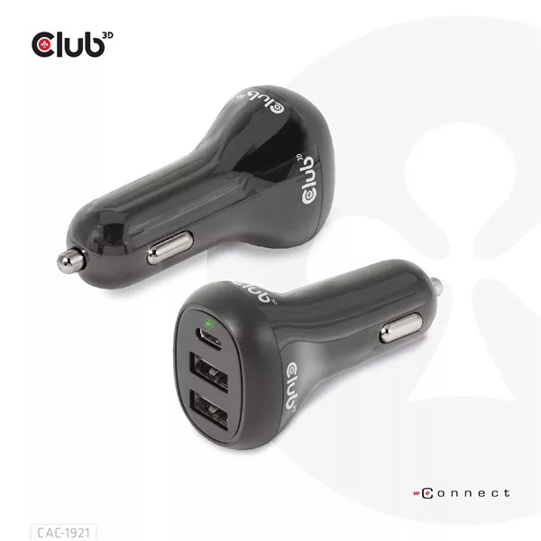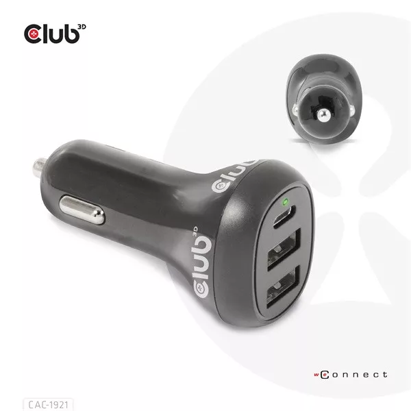 A Club 3D CAC-1921 nagy teljesítményű és divatos megjelenésű autós töltő. Lehetővé teszi különféle eszközök (pl.: digitális kamerák, PDA-k, mobiltelefonok, USB kiegészítők) töltését autójában szükség esetén. Három USB-csatlakozóval rendelkezik (egy USB Type-C és két USB Type-A csatlakozó) a töltéshez. Ez a termék három eszköz egyidejű töltését teszi lehetővé, maximális kimeneti teljesítménye 36 watt. Az USB Type-C port kifejezetten Type-C-t támogató eszközök részére lett kialakítva. Kérjük, győződjön meg róla, hogy megfelelő teljesítményű kábeleket használ a Club 3D-től. A töltő optimális használatához legalább 60 watt teljesítményű kábeleket javasoljuk. Használata egyszerű és kényelmes!