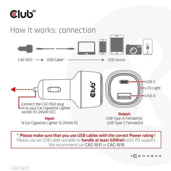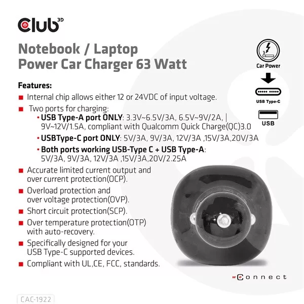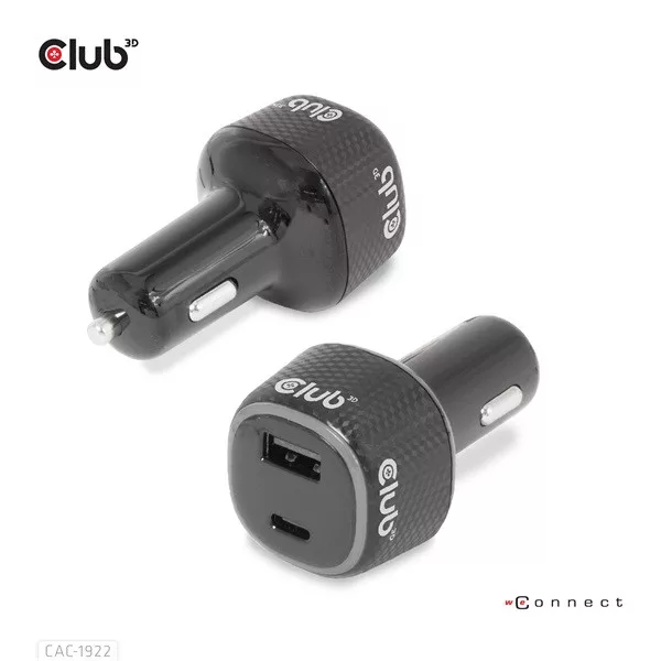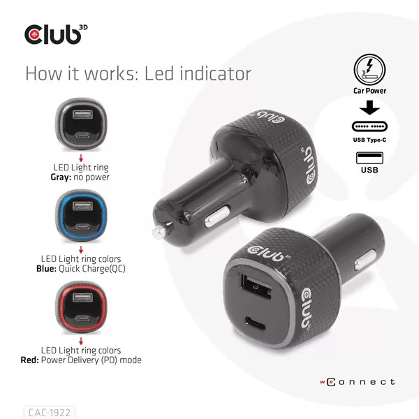 A Club 3D CAC-1922 egy nagy teljesítményű és divatos design max. 63 Wattos autós töltő QC3.0 és Power Delivery (PD) támogatással. Ezzel a töltővel bármilyen eszközt (pl. digitális fényképezőgépek, PDA-k, notebook számítógépek, mobiltelefonok, USB-tartozékok) tölthet autójával, ha arra szükség van. Két USB-csatlakozóval van felszerelve (egy USB Type-C csatlakozó és egy USB Type-A csatlakozó) a tápellátáshoz. Ez a termék lehetővé teszi két eszköz egyidejű töltését, és a termék maximális teljesítménye 63 watt. Az USB-C portot kifejezetten a Type-C támogatott eszközökhöz tervezték. A QC és a PD töltés megkülönböztetésére a LED jelzőfény kékre vált a Quick Charge (QC) vagy pirosra az áramellátás (PD) módban.