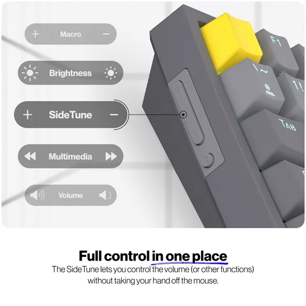 A bevált okostelefon-megoldások ihlette SideTune lehetővé teszi a hangerő szabályozását anélkül, hogy levennéd a kezed az egérről. Funkcióját makrókra, népszerű irodai parancsikonokra, médiabillentyűk és egérgombok között is módosíthatod.