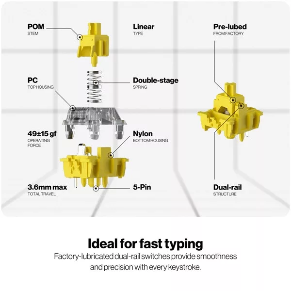 A gyárilag kenett, kétsínes kapcsolók garantálják a simaságot és a pontosságot minden billentyűleütésnél. A kétlépcsős, összenyomott rugós konstrukció viszonylag állandó nyomáskülönbségeket tart fenn, így a billentyűzet tökéletes a gyors gépeléshez.