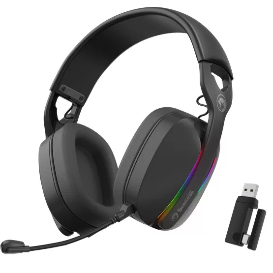 Marvo Pulz 70W Wireless Gaming Headset Fekete - Kiosztás: over-ear - Vezeték nélküli/vezetékes - Csatlakozás: 2,4 GHz + Bluetooth 5.3 + 3,5 mm jack - Hangszóró átmérő: 40 mm - Frekvencia válasz: 20 Hz - 20 kHz - Mikrofon: irányított, levehető