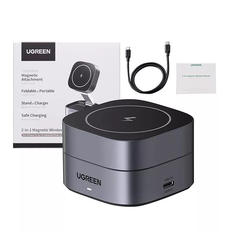 A Ugreen W256 Qi 2-in-1 induktív töltő egy fejlett töltési megoldás, amely lehetővé teszi az iPhone és az AirPods egyidejű töltését, kényelmet és időmegtakarítást biztosítva. Modern dizájnjával és számos funkciójával tökéletes kiegészítője bármely irodának, otthonnak vagy akár útközben is. Megjegyzés: Az USB-C töltő nem tartozék.