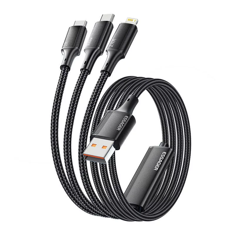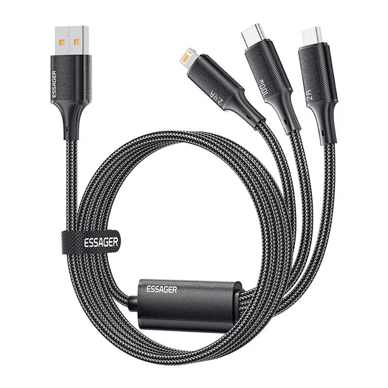 Az Essager kábel három különböző csatlakozót (USB-C, Lightning és Micro USB) kombinál. A tartozék lehetővé teszi az egyidejű töltést 100W-os teljesítménnyel és az adatátvitelt több eszközről.