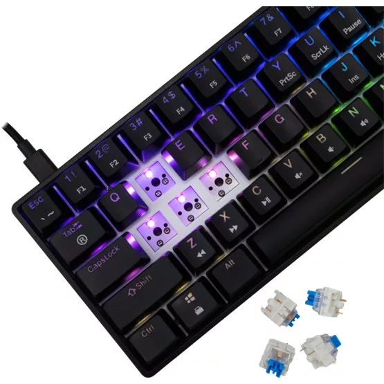 Magyar kiosztású billentyűzet, Kapcsolók típusa: mechanikus, Kapcsolók színe: kék, Kapcsolók száma: 61/62, Világítás: RGB, Csatlakozás: Type C - USB 2.0, Kábelhossz: 1.8m, Színe: fekete