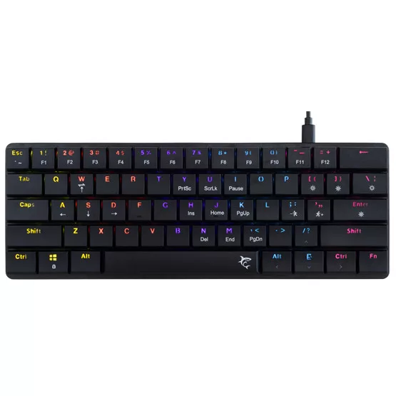 Angol kiosztású billentyűzet, Kapcsolók típusa: mechanikus, Kapcsolók színe: piros, Kapcsolók száma: 61, Világítás: rainbow, Csatlakozás: USB 2.0, Kábelhossz: 1.5m, Színe: fekete