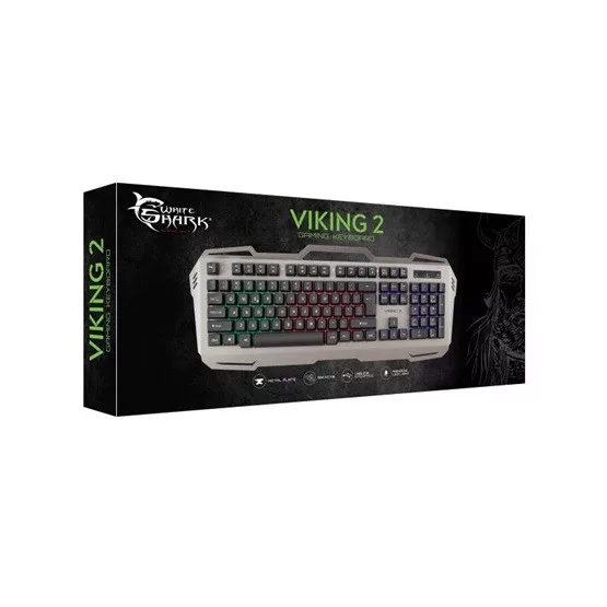 White Shark VIKING-2, GK-1924 vezetékes gamer billentyűzet, kiváló minőségű 104 gombos membrános kivitel, angol kiosztás. Fémlemez borítás, középen egy mobil telefon tartóval.