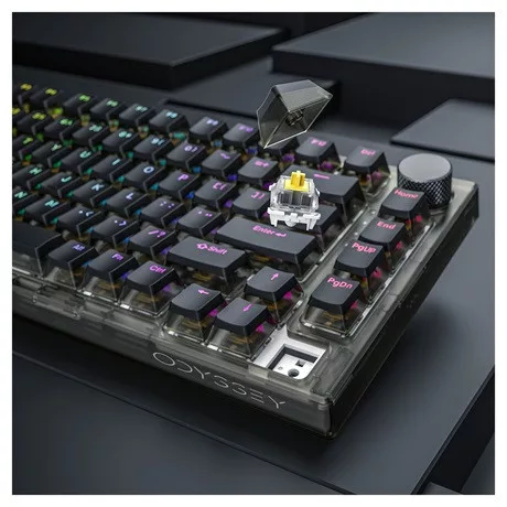 Ismerje meg a helytakarékos kialakítás megtestesítőjét - az ODYSSEY billentyűzetet kompakt, 75%-os testelrendezéssel. Ez a billentyűzet kompromisszumok nélküli hatékonyságot kínál, és a funkcionalitás határait feszegeti, miközben értékes helyet takarít meg az íróasztalán. Az ODYSSEY-t úgy tervezték, hogy az összes alapvető billentyűzetfunkciót kisebb méretben kínálja, így zökkenőmentesen illeszkedik a modern munkahelyekhez, diákszállásokhoz és kreatív terekhez. Az innováció azonban nem csak a méretről szól - készüljön fel a váratlan dolgokra. A jobb felső sarkot egy gondosan megmunkált fémgomb díszíti, amely a kifinomult ízlés érzetét kelti. Ez a vezérlő azonban több mint egy vizuális elem; a hang azonnali vezérlését is lehetővé teszi. Gazdagítsa a multimédiás élményt a hangerő és a lejátszás/szünet vezérlésével; a hangot csak egy csavarással vagy ennek a vezérlőnek a megnyomásával szabályozhatja. Az ODYSSEY nemcsak a munkahelyi rendhez járul hozzá, hanem egy csipetnyi eleganciát is tartogat, hogy felkeltse a kíváncsiságot és újradefiniálja a funkcionalitást.