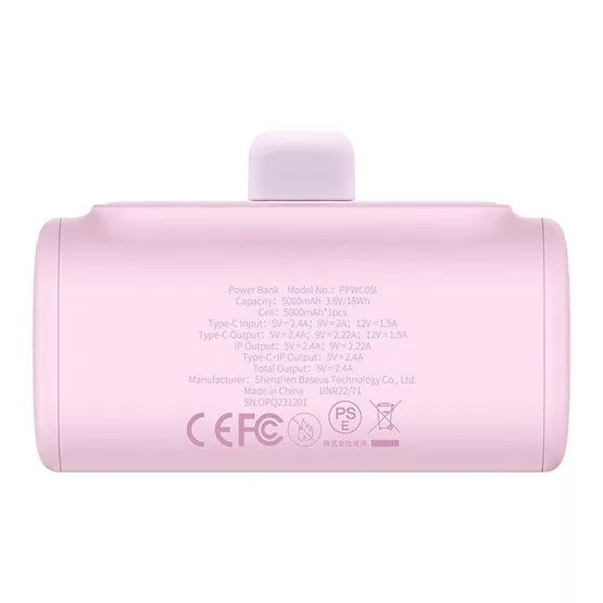 Baseus Compact gyorstöltő powerbank 5000 mAh, 20W iPhone csatlakozóval, rózsaszín